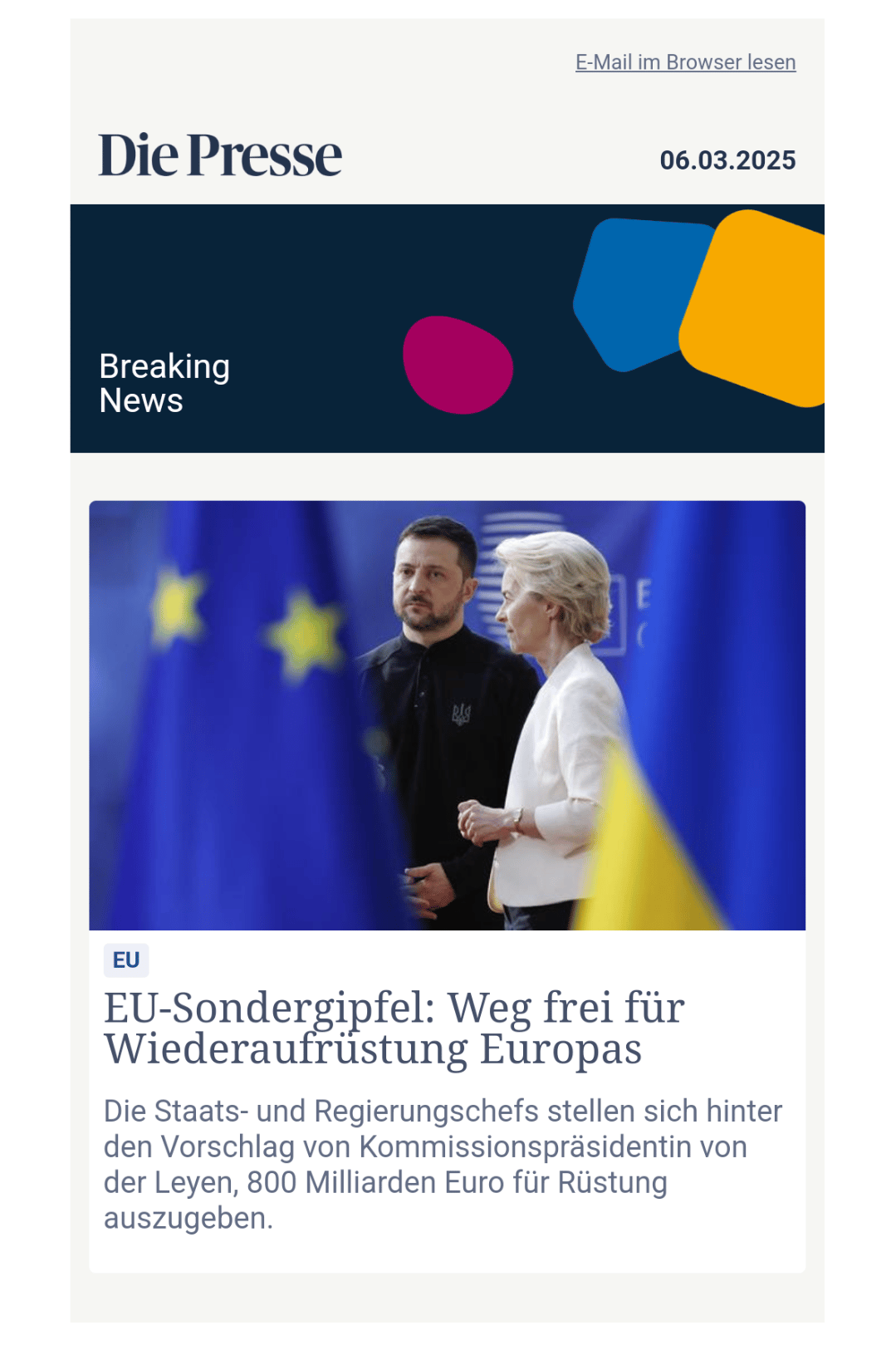 Breaking News von “Die Presse” per Mail: Teaser, der auf einen Artikel auf der Website verlinkt.