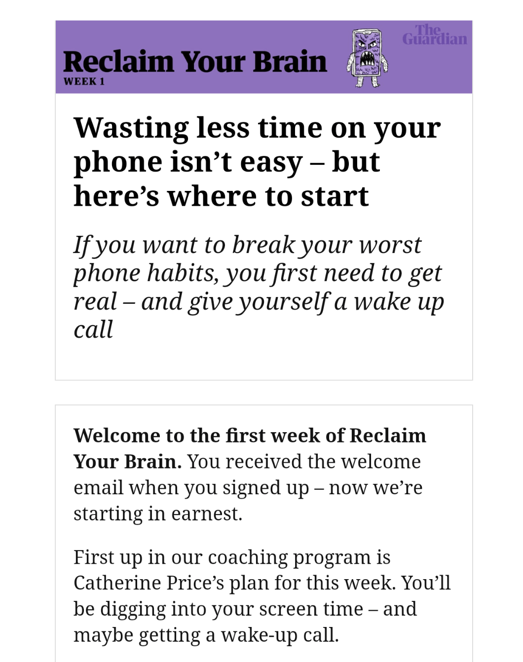 Die Mail-Serie “Reclaim your Brain” von The Guardian hilft dir dabei, neue Routinen zu entwickeln, um weniger Zeit am Smartphone zu verbringen.