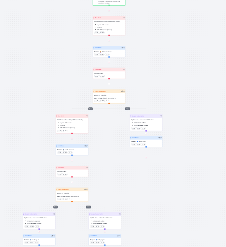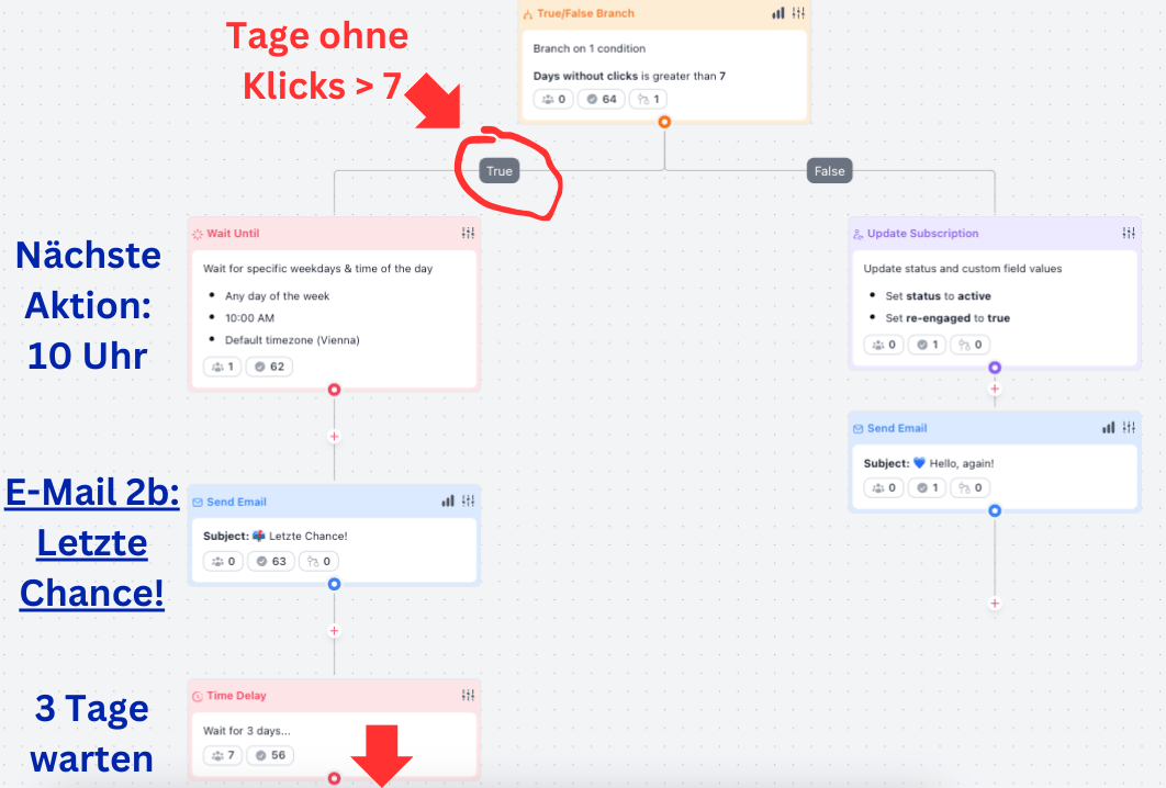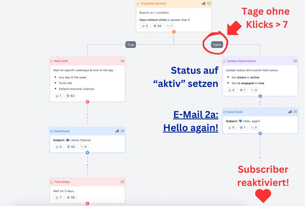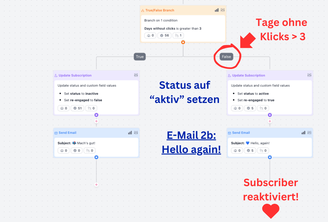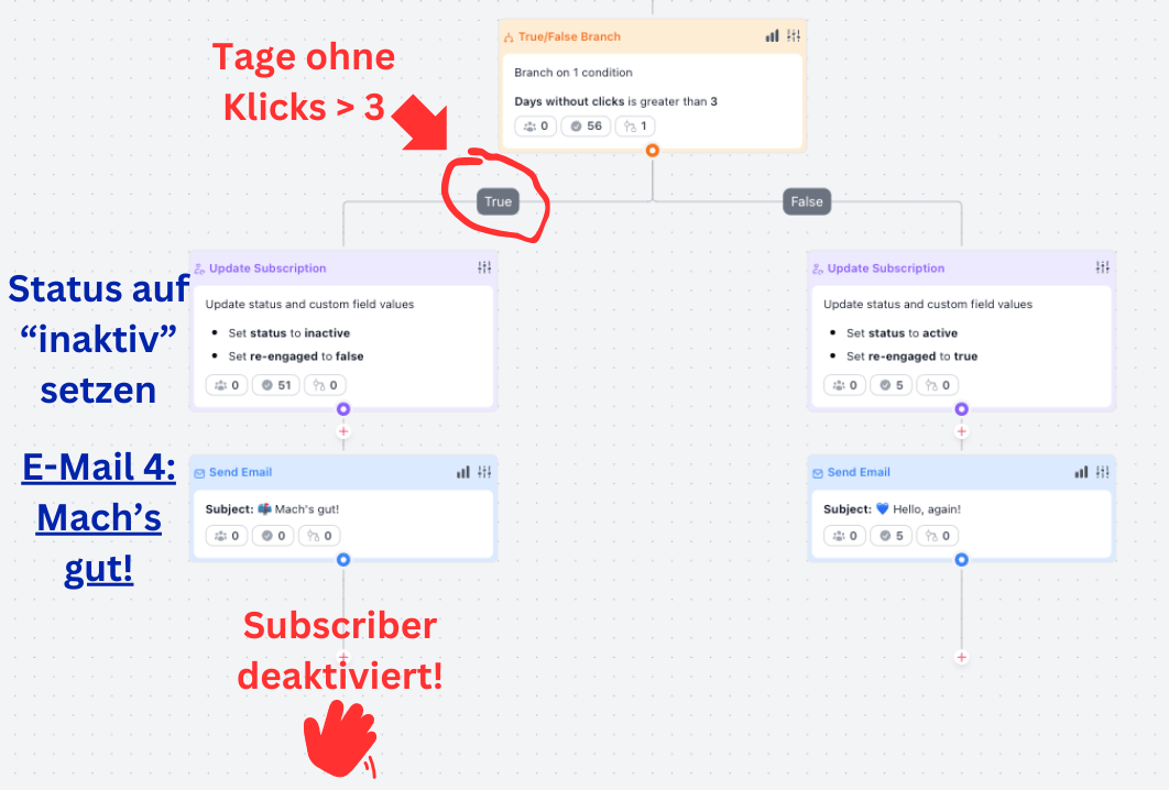 Zweig “Tage ohne Klicks > 3” = falsch: Der Subscriber rutscht in diesen Zweig …